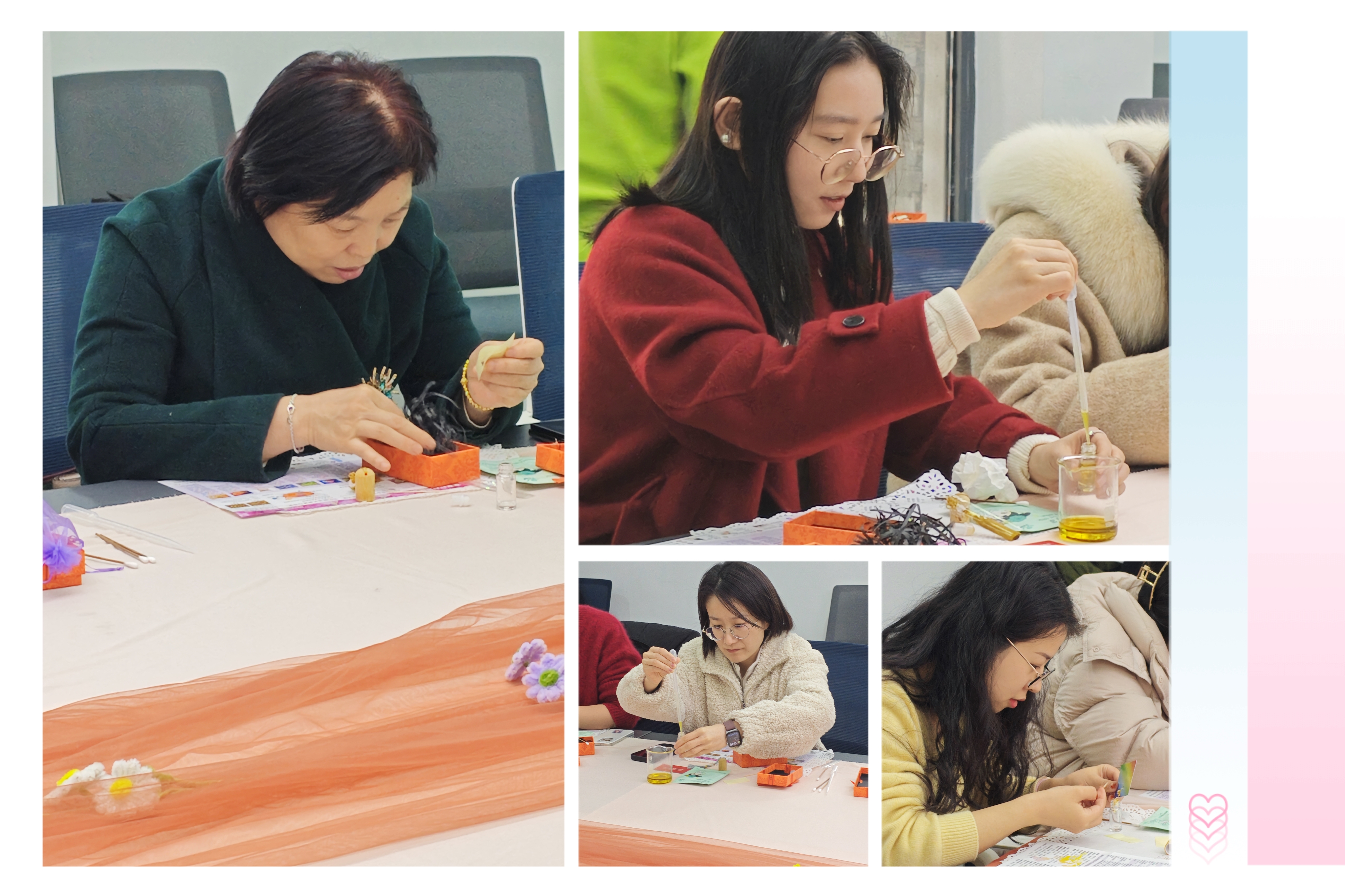 活动现场,芬芳萦绕,暖意融融。女教工们兴致盎然地参与其中,在专业的指导下,沉浸式体验芳香手工制作的乐趣。大家专注于手中的创作,挑选心仪的香材,搭配专属的香气,将巧思与心意融入每一件手工作品中。制作过程中,老师们彼此交流心得、分享技巧,欢声笑语不断,在协作与互动中增进了同事间的情谊,也让身心在芬芳的氛围中得到充分放松。